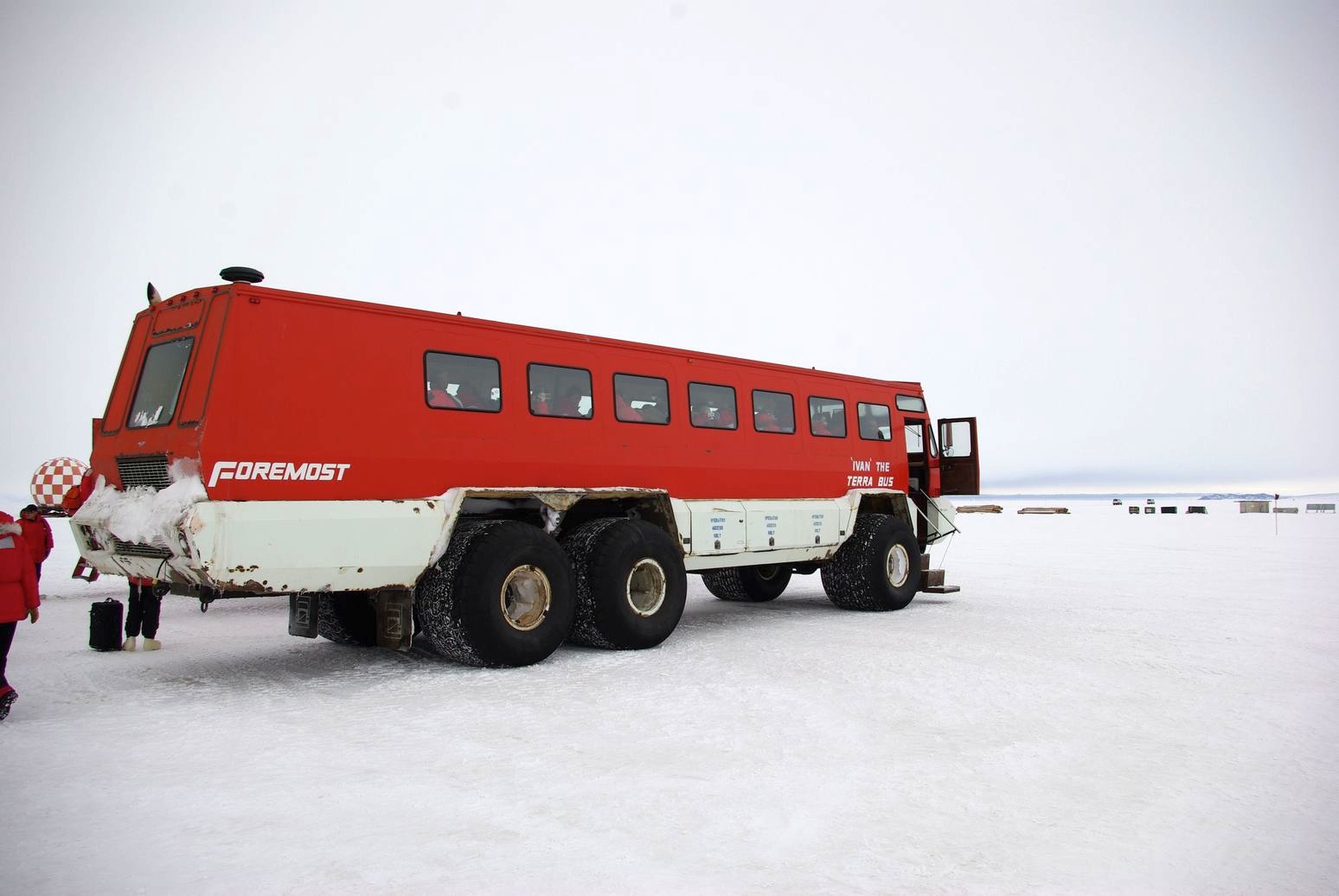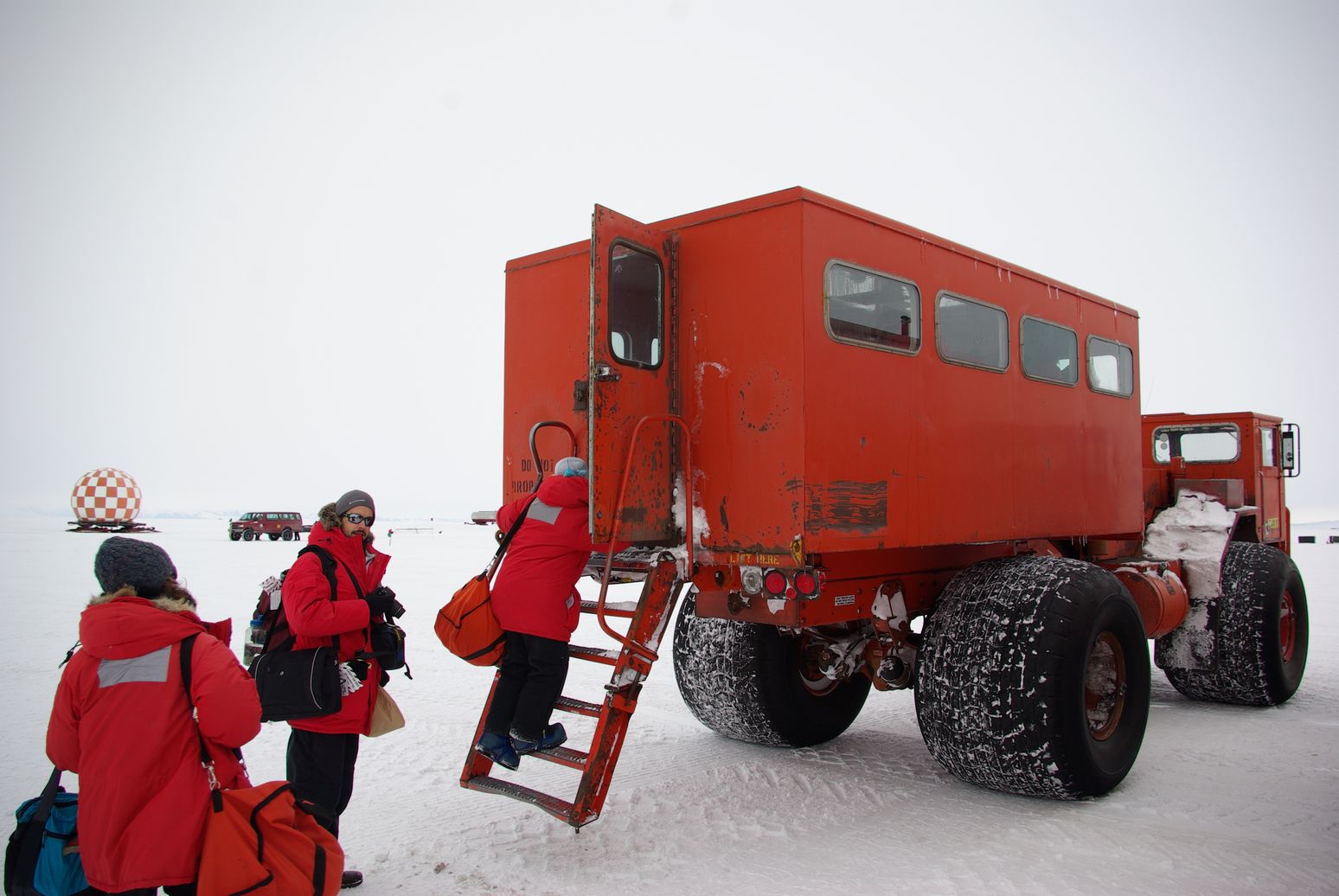 Shortly after stepping into the snow, we had to jump into one of the two charismatic vehicles that were ready to transport us to McMurdo Station. We could choose between the famous Ivan the Terra Bus (red as our parka, a.k.a. the Big Red) or an orange delta truck from the early 80s (that vehicle was already carrying people from the runway to McMurdo station before I was born!). Both vehicles have incredibly big tires.